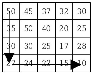 현재 제일 왼쪽 위 칸이 나타내는 지점에 있는 세준이는 제일 오른쪽 아래 칸이 나타내는 지점으로 가려고 한다. 그런데 가능한 힘을 적게 들이고 싶어 항상 높이가 더 낮은 지점으로만 이동하여 목표 지점까지 가고자 한다. 위와 같은 지도에서는 다음과 같은 세 가지 경로가 가능하다.